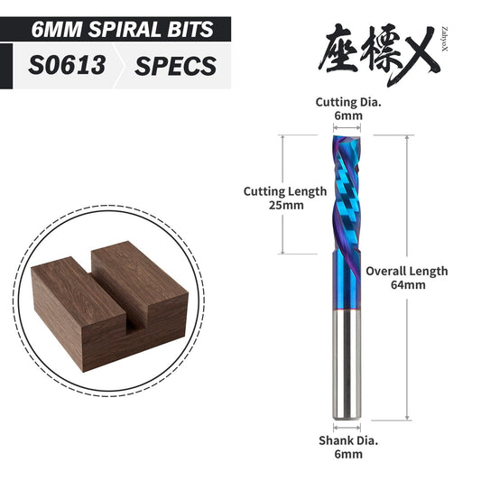 S0603 Spiralfräser aus Vollhartmetall, metrisch, Kompressions-Spiralform – 2 Schneiden – 6 mm SD – 6 mm CD – 22 mm CL – 64 mm OL – 3/16 UCL