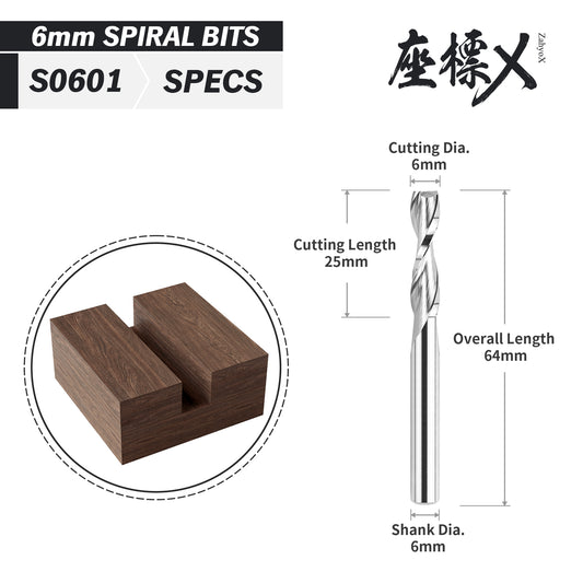 S0601 metrischer Spiralfräser aus Vollhartmetall mit Aufwärtsschnitt - 2 Schneiden - 6 mm SD - 6 mm CD - 25 mm CL - 64 mm OL