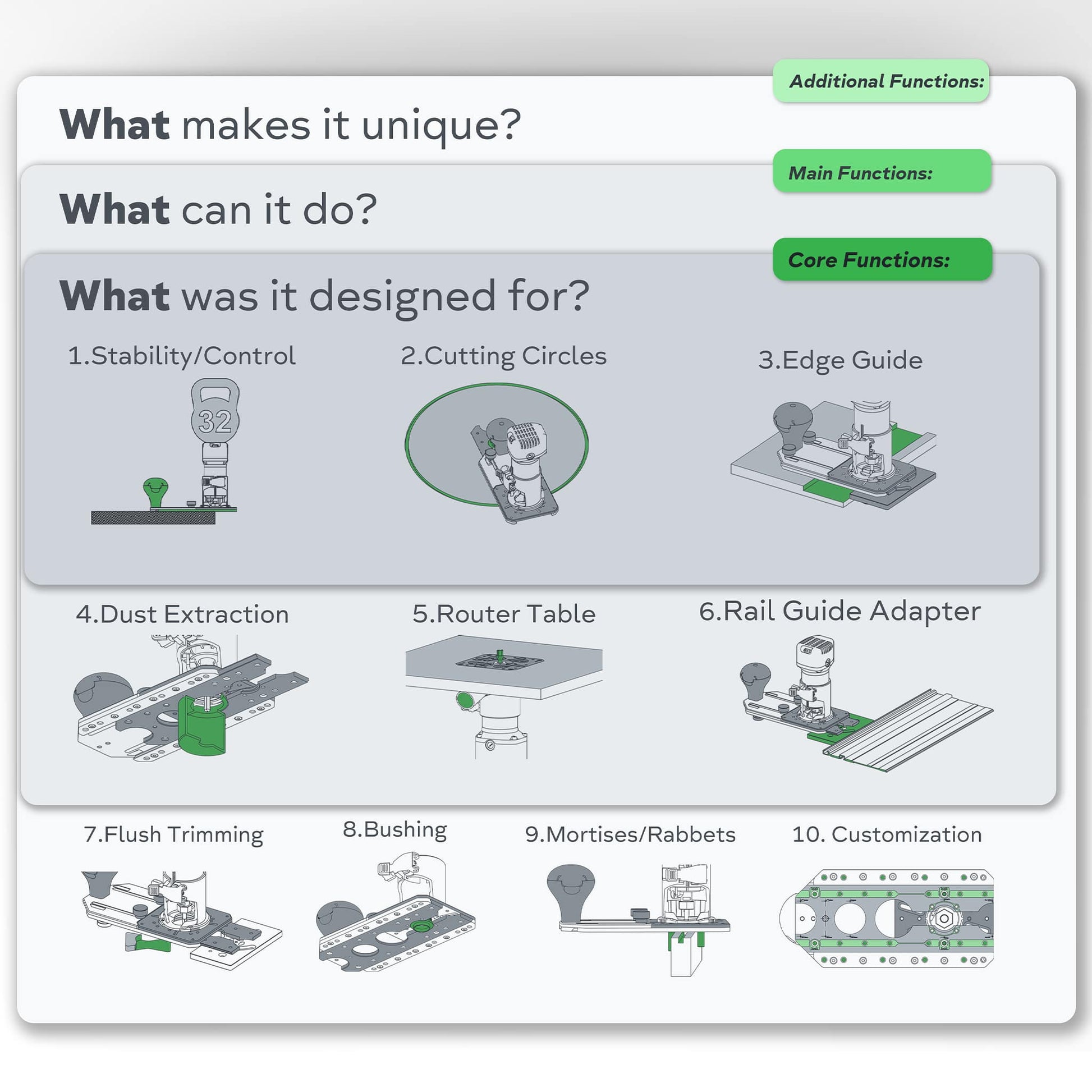The Multifunctional Trim Router Jig offers an innovative space-saving solution for woodworkers. Combining the functionality of ten essential tools into one, it frees up valuable workspace and allows for greater organization and efficiency in your creative pursuits. Additionally, it improves the safety of your work. Transform even the smallest workshop into a fully equipped woodworking studio with this game-changing tool.
